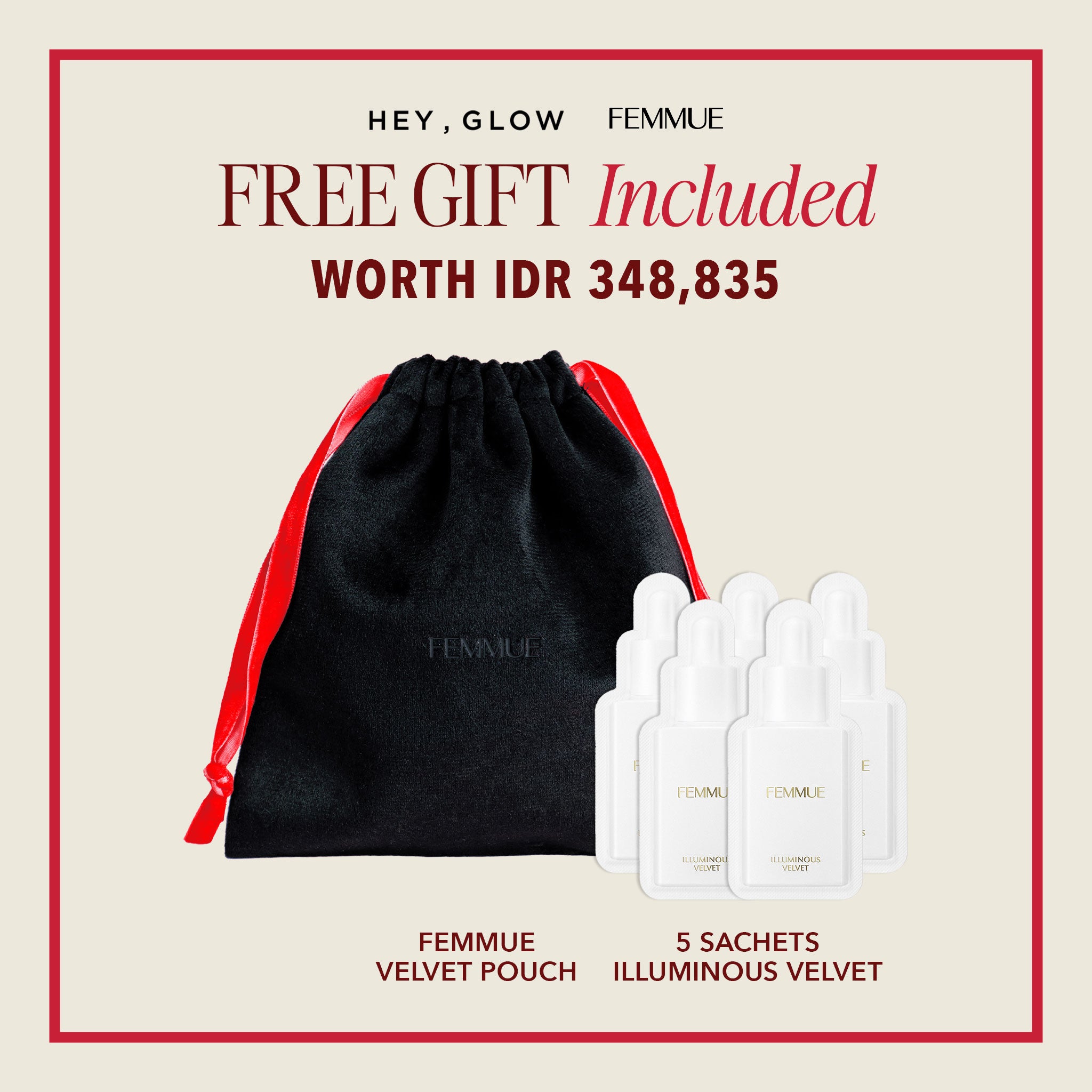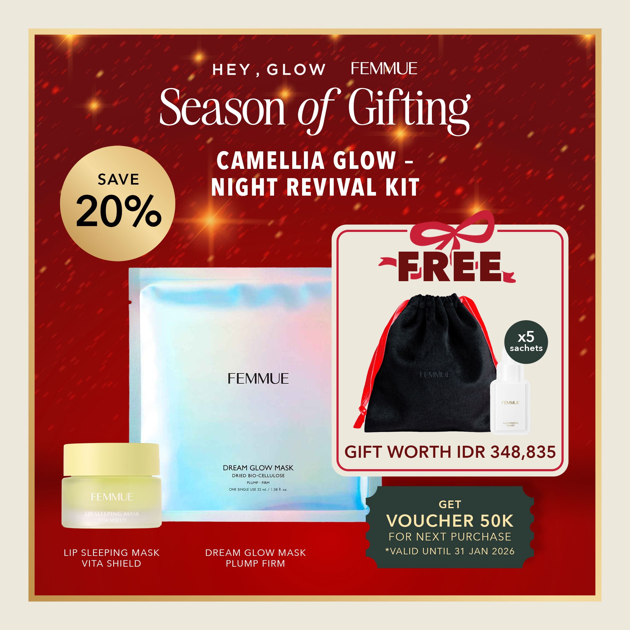 Berikan sentuhan holiday glow pada rutinitas malam dengan Bundle Camellia Glow – Night Revival Kit, perpaduan skincare eksklusif FEMMUE untuk bibir dan kulit yang lebih sehat, kenyal, dan bercahaya. Di dalamnya terdapat Lip Sleeping Mask – Vita Shield yang bekerja mencerahkan, melembapkan, dan meregenerasi bibir dengan lembut, serta Dream Glow Mask Plump Firm yang memberikan hidrasi mendalam dan efek plump untuk kulit tampak muda dan supple. Bundle ini semakin lengkap dengan FREE Femmue Velvet Festive Pouch yang hanya tersedia musim Natal & Tahun baru. Dan 5 pcs Illuminous Velvet Serum 1ml, hadiah spesial edisi akhir tahun yang menambah nilai lebih dalam setiap pembelian.